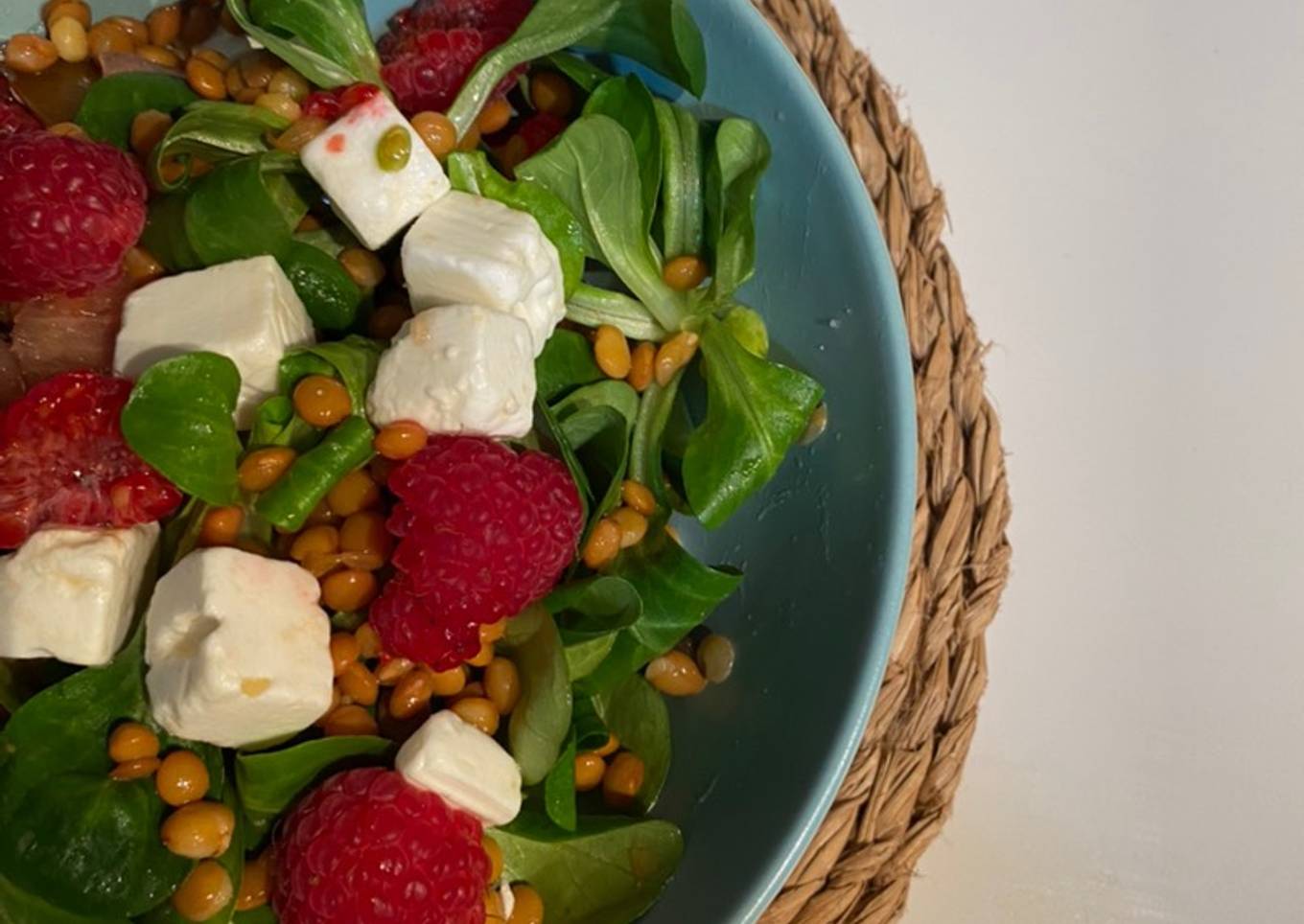 Ensalada de lentejas, can贸nigos, frambuesas y queso feta 馃ガ馃崜馃