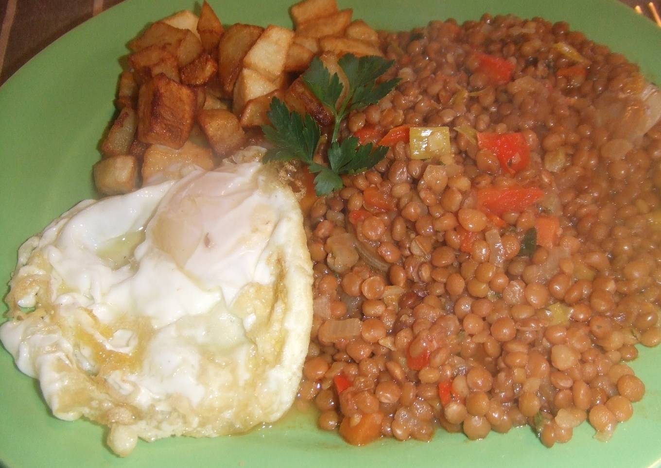 - Freír los huevos y servir las lentejas acompañadas con las patatas y los huevos fritos.