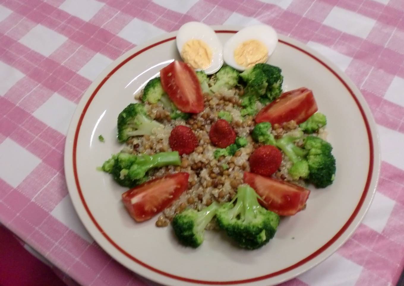 - Ponemos en los platos y encima colocamos el brócoli, el tomate y el huevo cocido (yo en mi plato también le puse unas fresas).