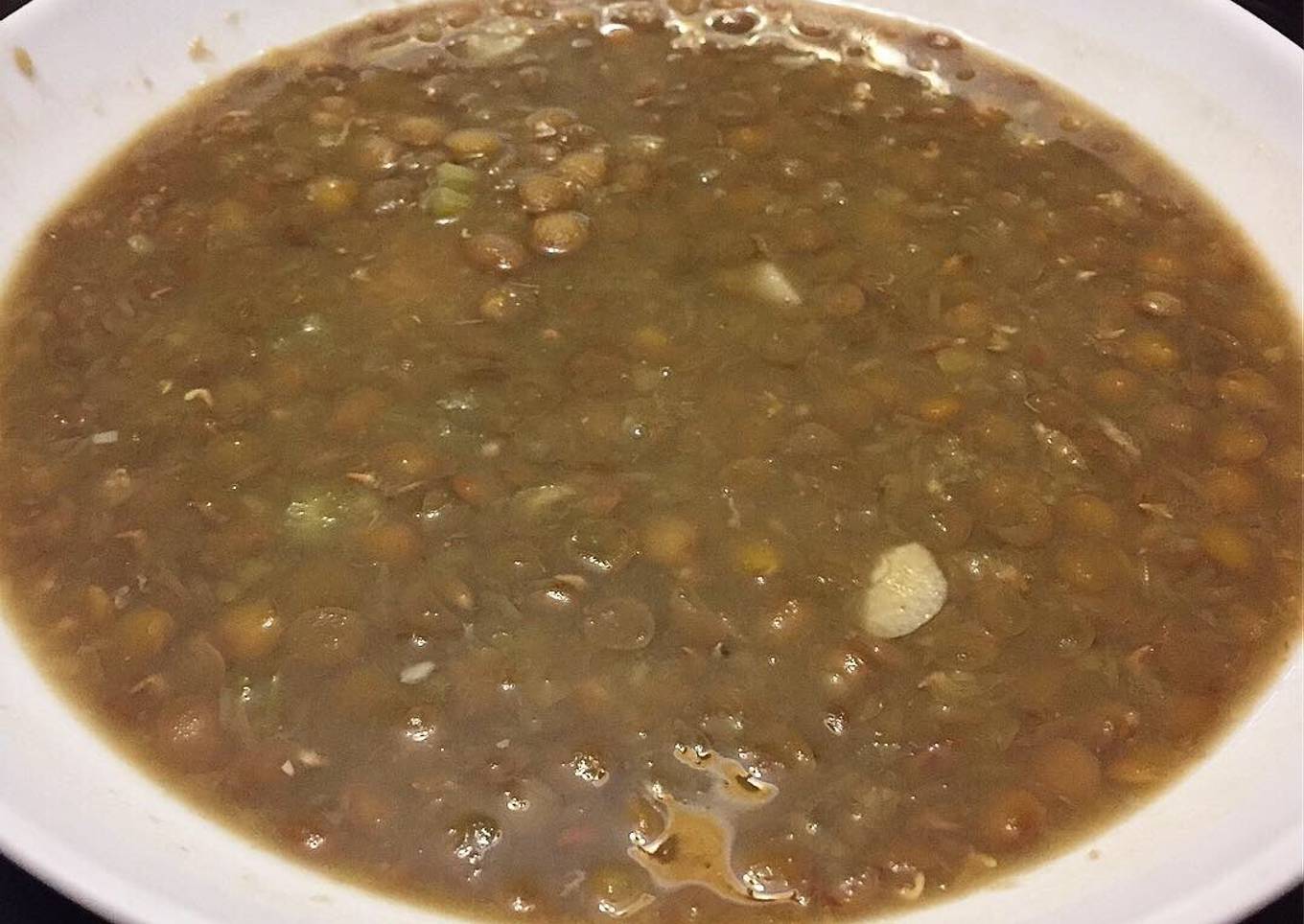 - En la olla calentamos aceite, doramos cebolla, ajíes, apio y ajos sin quemarlos. Agregamos el agua, culantro, pimienta y la sal. Revolvemos y agregamos las lentejas y los patacones.