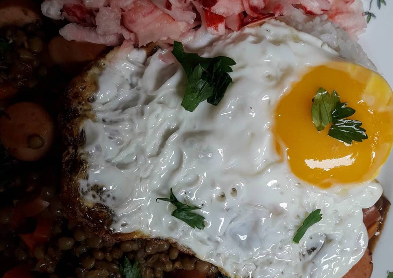 - Sigue con las lentejitas que ya están cocidas, y pones el orégano refregado con las manos. Mueves bien y tapas la olla. Cuando rompa el hervor a partir de ahí das 5 minutos, en ese tiempo ya están cocidas las zanahorias, al último agregas el pimiento, mueves bien rectifica la sazón, das 1 minuto más, y apagas el fuego. Dejas reposar 5 minutos. Ya debes tener listo tu arrocito graneado, vas friendo los huevos (opcional) y una ensaladita si deseas. Emplatas. Por encima esparces perejil picadito.