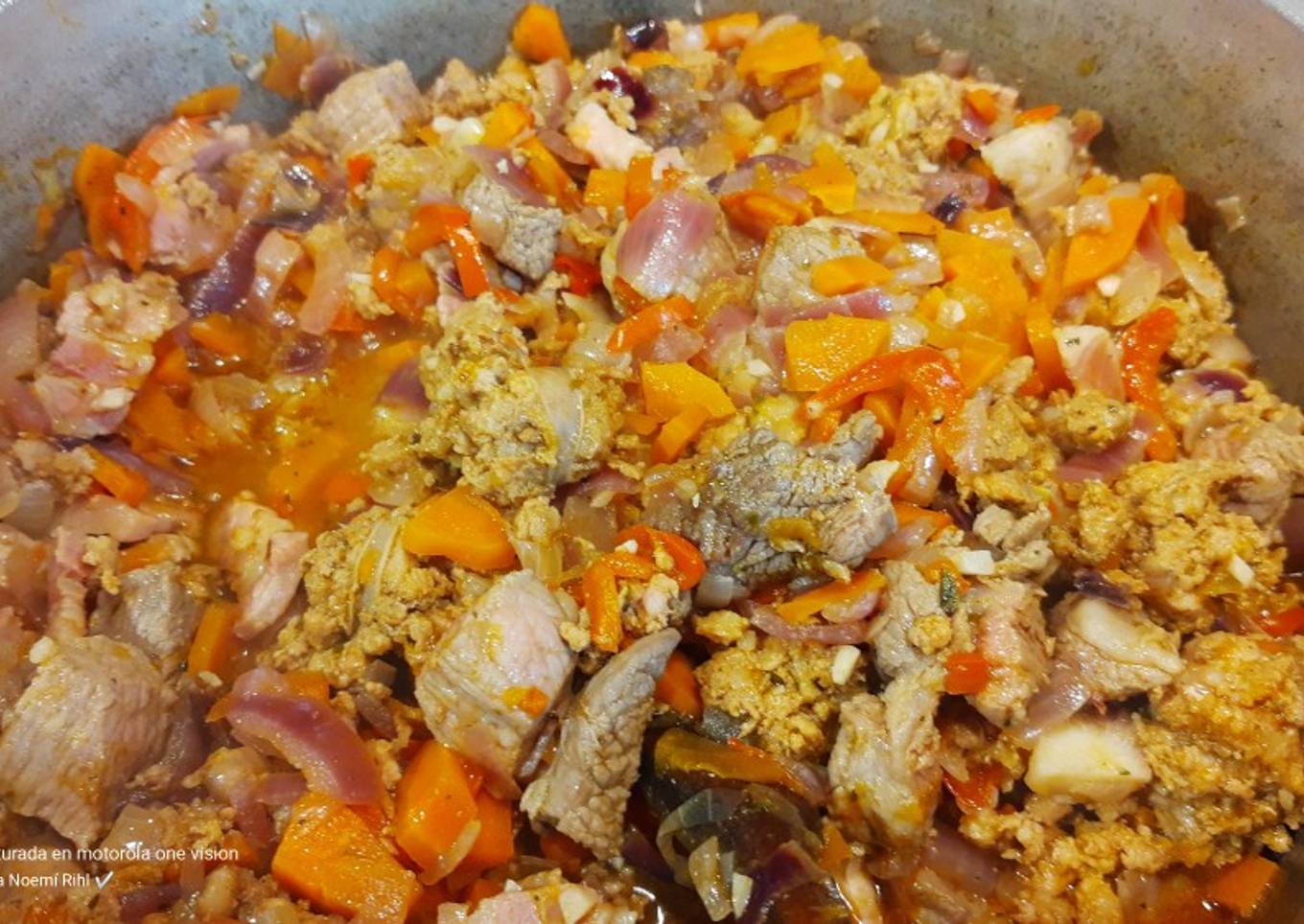 - Rehogar la cebolla el morrón la zanahoria el ajo todo picado y la panceta en tiritas, cuando está a medias agregar el chorizo y la carne todo cortado en trocitos.