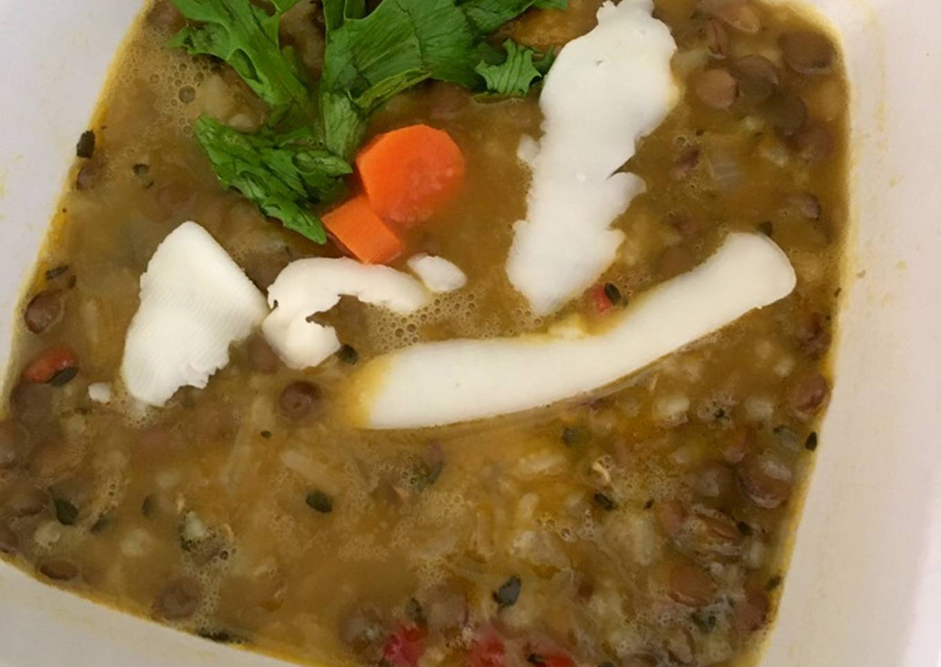 - Sofreír cebolla con pimentón, salpimentar a gusto. Una vez cocida la cebolla agregar la lenteja