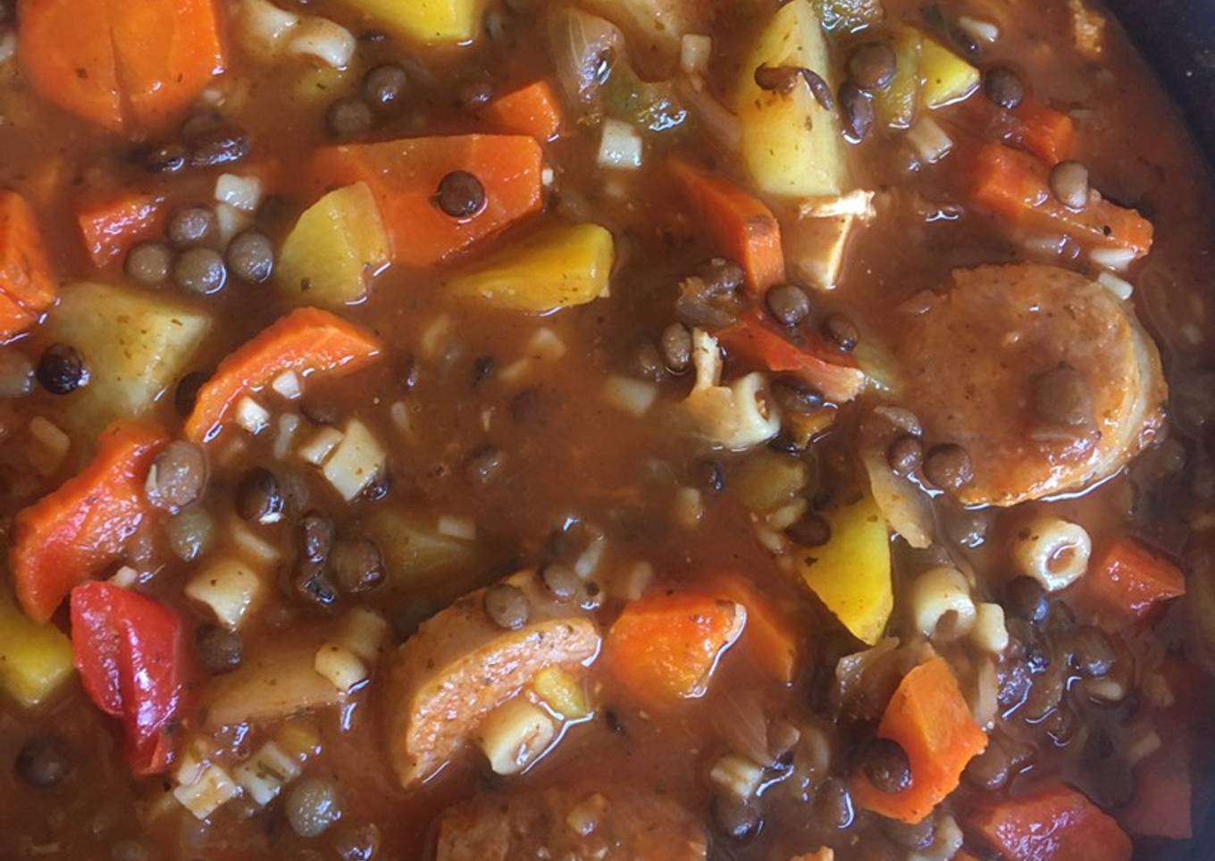 - Una vez que esto esté cocinado incorporar las lentejas (ya hervidas) en este caso incorpore también un chorizo(opcional) que ya tenía hecho. Condimentar a gusto (yo le puse ajo deshidratado, pimienta, sal, condimento de pizza, orégano y dos hojitas de laurel). Hervir unos minutos más todo junto. Esperar que se enfríe y servir.